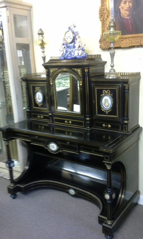 Davis and Company Ebonized Escritoire Sevres Portrait & Floral Plaques in the Louis XVI Style Made in Stoffenham, England, Ca. 1850, Dimensions are 55" x 48" x 24"