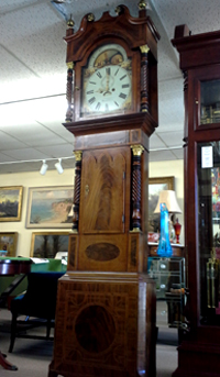 English Tall Case Clock from Birmingham, England - Beautiful Inlaid Wood with Handpainted Dials and Three Brass Finials ca. 1850