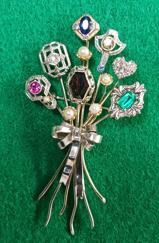 Stickpin Brooch Yellow Gold & Platinum with Diamonds, Rubies, Sapphires and Pearls